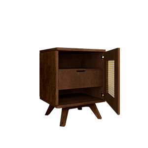 Designed for timeless furniture lovers, the Harrison Bedside Table is strikingly handcrafted in solid walnut wood, four-legged structure, with a matte-smoked finish, and rattan details.