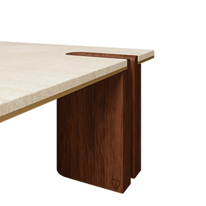 The Grenville center table features a captivating blend of travertine and wood. Travertine, a variety of limestone, brings a cozy, earthy hue and organic patterns, while the walnut wood table infuses the design with warmth and tactile richness.