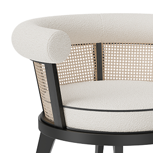 The timeless George armchair is handcrafted in black stained ashwood with rigorously expertise by Portuguese artisans, and its round seat is upholstered in bouclé and velvet. Along with carefully selected wood, George is enriched with the rattan on its back, giving it a classy touch. The high-class George Armchair will bring to any room a majestic hint of an exclusive sitting atmosphere.